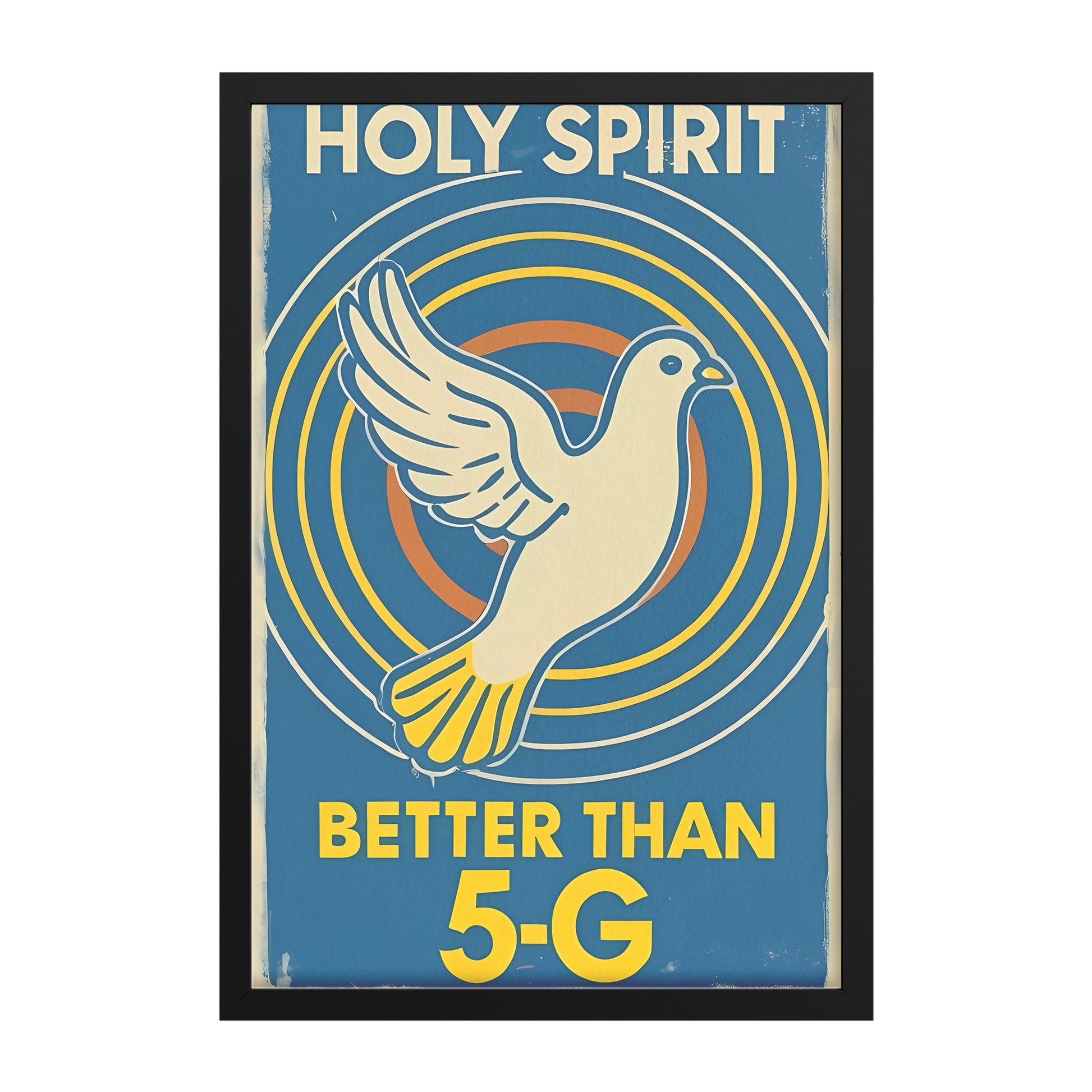 This framed poster captures the essence of retro charm while delivering a message of profound spiritual connectivity and the lighthearted imagery of a pigeon, symbolizing the Holy Spirit's presence. The words, "Holy Spirit: Better than 5G," are playfully and lovingly displayed, inviting you to embrace the most reliable and divine connection available.